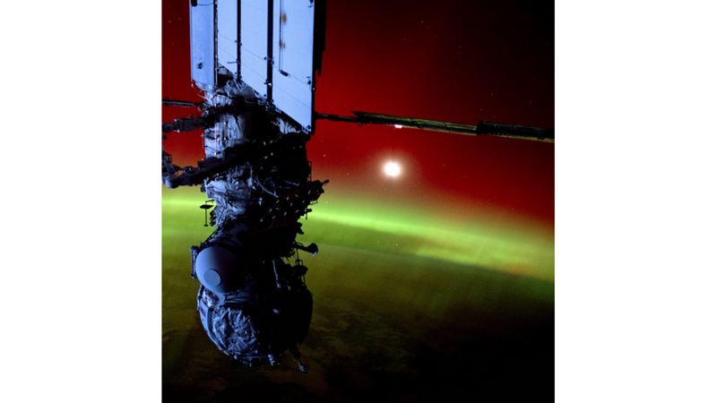 Image description: Behind the modules of the International Space Station, the aurora, a green and red haze that curls over the Earth, is visible. A few stars are also visible.